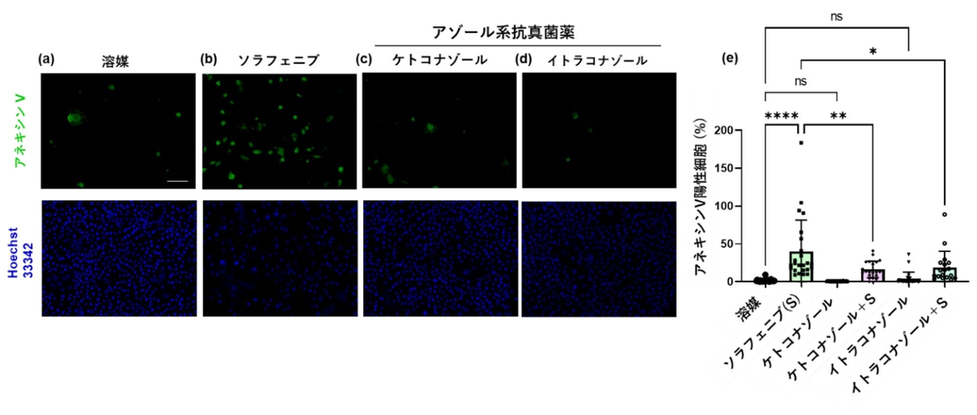 アネキシンVはアポトーシス細胞で陽性となる。培養NHEKに7 μMソラフェニブを添加するとアネキシンV陽性細胞(緑色)が増加し、アゾール系抗真菌薬として1 μM ケトコナゾールまたはイトラコナゾールを添加するとアネキシンV陽性細胞数が有意に減少した。以上のことから、アゾール系抗真菌薬はソラフェニブよるアポトーシスを阻害し、細胞保護作用を示すことが明らかとなった。細胞の核はHoechst33342で可視化した(青色)。