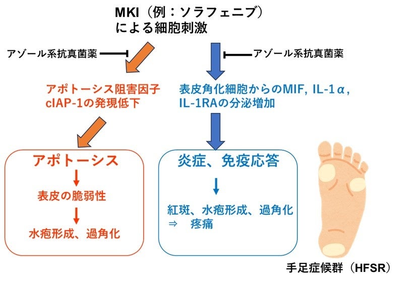 ソラフェニブによる細胞刺激は、表皮角化細胞におけるアポトーシス阻害因子cIAP-1の発現低下をもたらし、アポトーシスを誘導する。また表皮角化細胞からのMIF、IL-1α、IL-1RAの分泌を増加させ、炎症や免疫応答を誘発する。これにより、紅斑、水疱形成、過角化といったHFSRの症状が現れる。アゾール系抗真菌薬はアポトーシス阻害と炎症性サイトカインの分泌抑制により、細胞保護作用をもたらす。