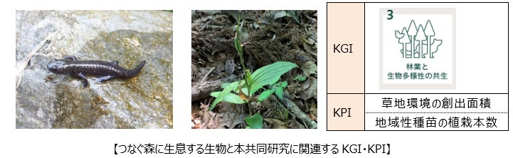 野村不動産ホールディングスは、2022 年より「つなぐ森」を軸に「気候変動や生物多様性の損失等の社会課題の解決」と、自社グループでの「不動産開発事業等での利活用」の両立を目指す「森を、つなぐ」東京プロジェクトを推進してきました。「つなぐ森」には、絶滅危惧種のヒガシヒダサンショウウオ、ギンラン等、50 種の重要種※3 の生息を確認しており(2025 年5 月時点)、この貴重な森の豊かさを保全するため、「野村不動産グループ生物多様性方針」に基づいて、つなぐ森の目指す姿(4 つのKGI)を定めています。当該KGI のひとつである「林業と生物多様性の共生」に対するKPI として、「草地環境の創出面積」や「地域性種苗の植林本数」を定め、生態系への負荷が少ない主伐等を計画的に進める等、外部の専門家や地域の共創パートナーとともに生物多様性の保全に取り組んでいます。