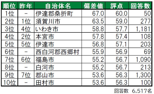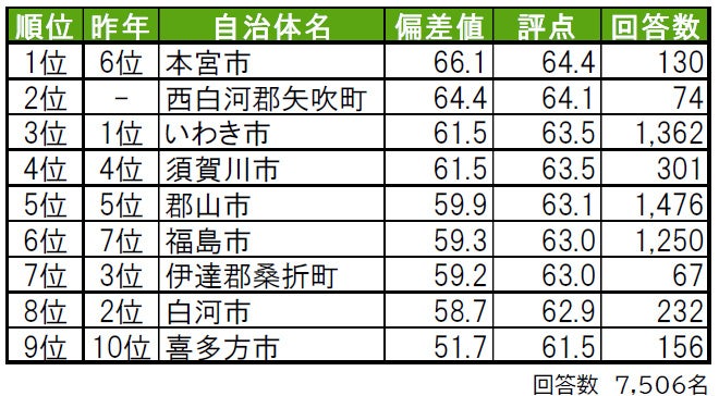 1位は本宮市で、「住み続けたい街」4位、「住みここち」「街に誇りがある」5位の街です。2位は西白河郡矢吹町で、昨年は偏差値50未満でしたが、今年は大幅に順位をアップしています。3位はいわき市で、「住み続けたい街」でも3位、「住みたい街」では5位となっています。
