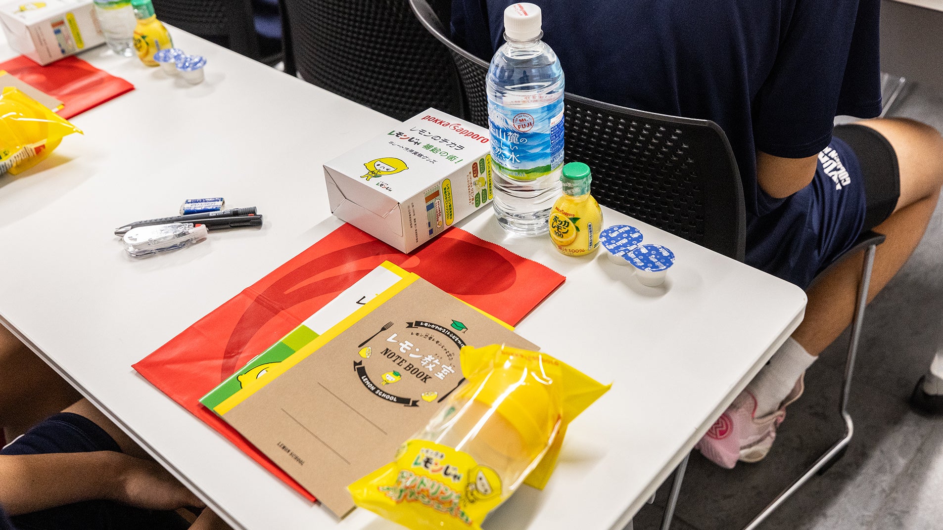 当日はポッカレモンや、タンパク質分解実験用のキット、レモンのビタミンCの効果やクエン酸によるキレート作用についての学習用ノートなどの教材を元に、成長期のアスリートに必要な栄養について学びました。