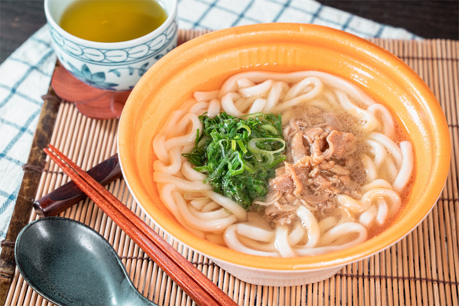 【商品特長】甘めに味付けした鶏肉とたっぷりの青ネギをのせた定番のうどんです。「つゆ」と、もっちりでやわらかな「麺」との相性もピッタリです。