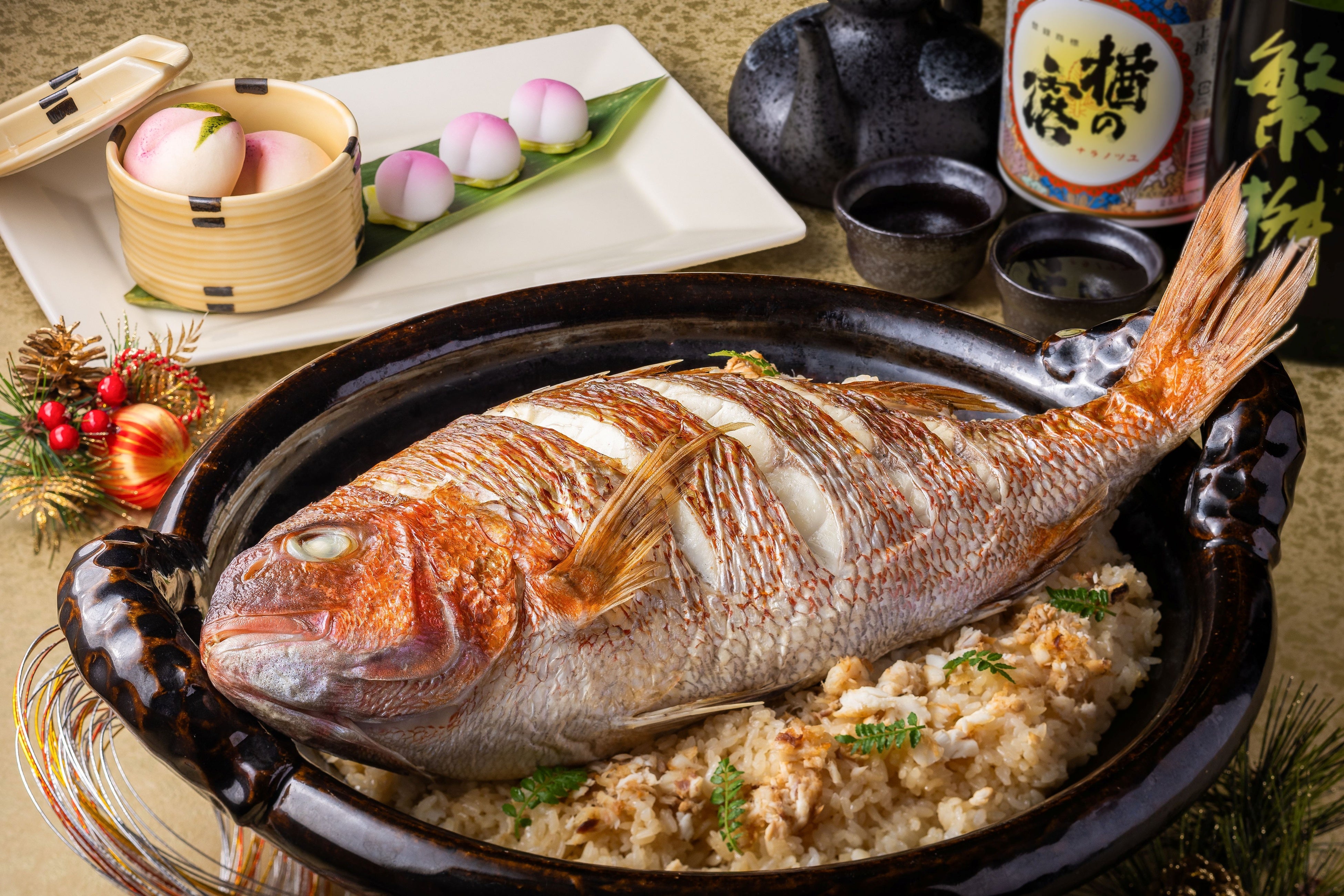 地元で水揚げされた真鯛を贅沢に使用した、鯛の炊き込みご飯はふっくらとした身の旨みが米一粒一粒に染みこんだ滋味深い味わいです。「めでたい」に通じる縁起の良い料理として運気上昇のゲン担ぎに堪能ください。
