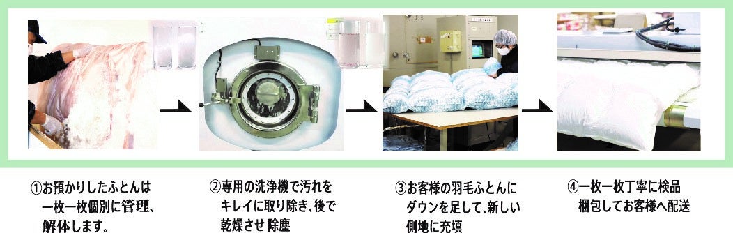 羽毛ふとんリフォームは、古い羽毛ふとんを解体、中の羽毛を取り出し、洗浄・除塵・乾燥します。 その後に、新しい羽毛を追加、新しい側生地に充填することでかさ高が蘇り、新品同様の羽毛布団に生 まれ変わります。