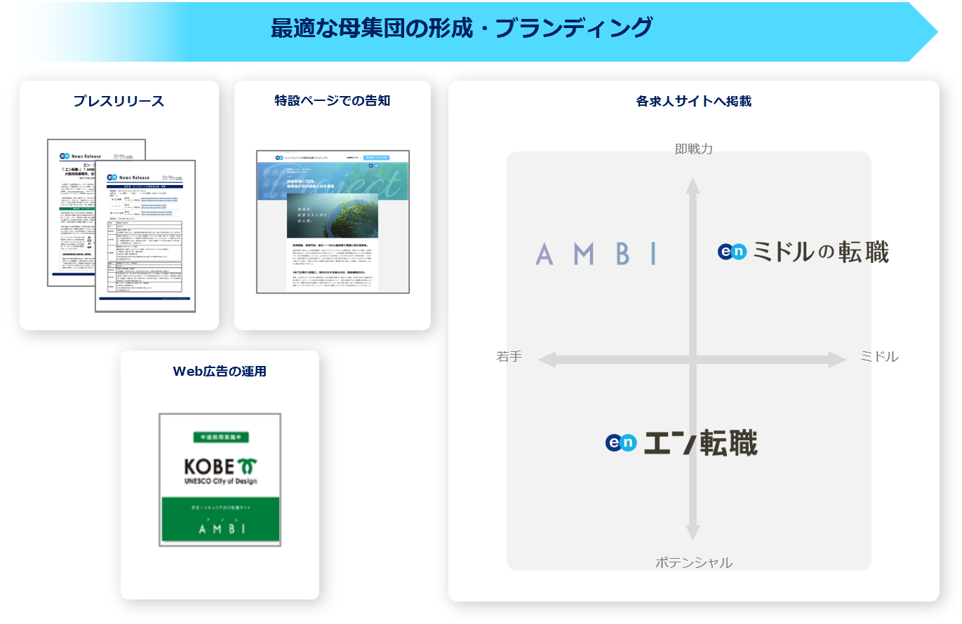 プレスリリースや特設ページ、Web広告での告知に加え、各求人サイトでの集客支援を実施。『エン転職』『AMBI』『ミドルの転職』とターゲットの異なる求人サイトを活用することで、ターゲットへ網羅的に求人を届けます。