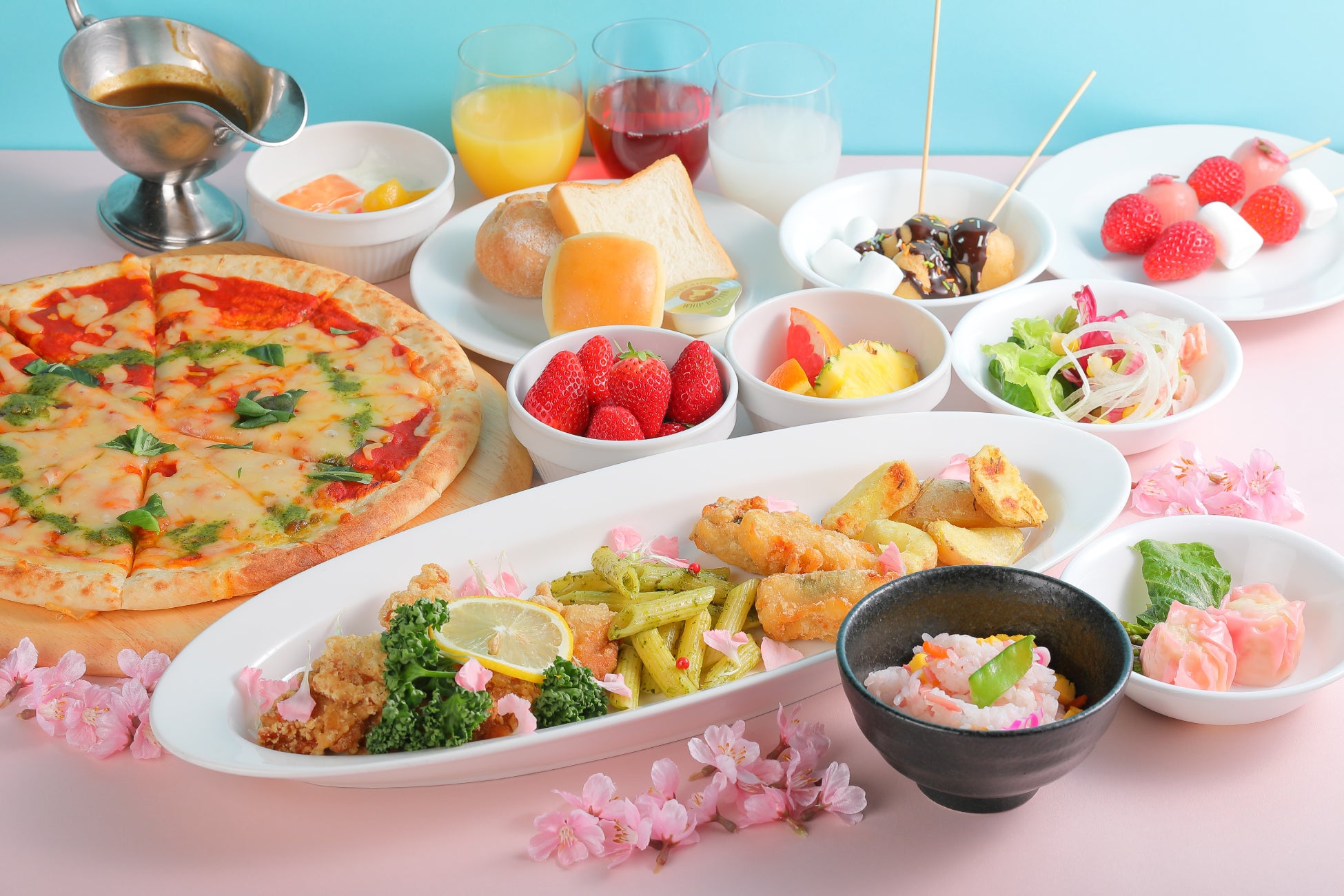 2025年1月に開催した「冬のご褒美ランチ~フルーツ&スイーツビュッフェ」では、期間中約1,000名のお客さまにお越しいただき、たっぷりご用意した「イチゴ」をメインに、大変ご好評いただきました。今回は2025年第2弾として、さらにお客さまにお楽しみいただけるよう、春色のスイーツ各種、和菓子、フード類を充実させ、春らしいワクワクが詰まったビュッフェ形式でご用意いたします。ピンク色のルビーチョコレートを使用した「チョコレートファウンテン」や自分でつくる「カスタマイズパフェ」、イチゴや和菓子を串に刺して一緒に味わう「イチゴ串」など、自分好みにアレンジするメニューもラインナップしております。また、スイーツだけでなく、カレーライスやちらし寿司、ピザやパスタなどもご用意いたしますので、ランチとしてもご利用いただけます。