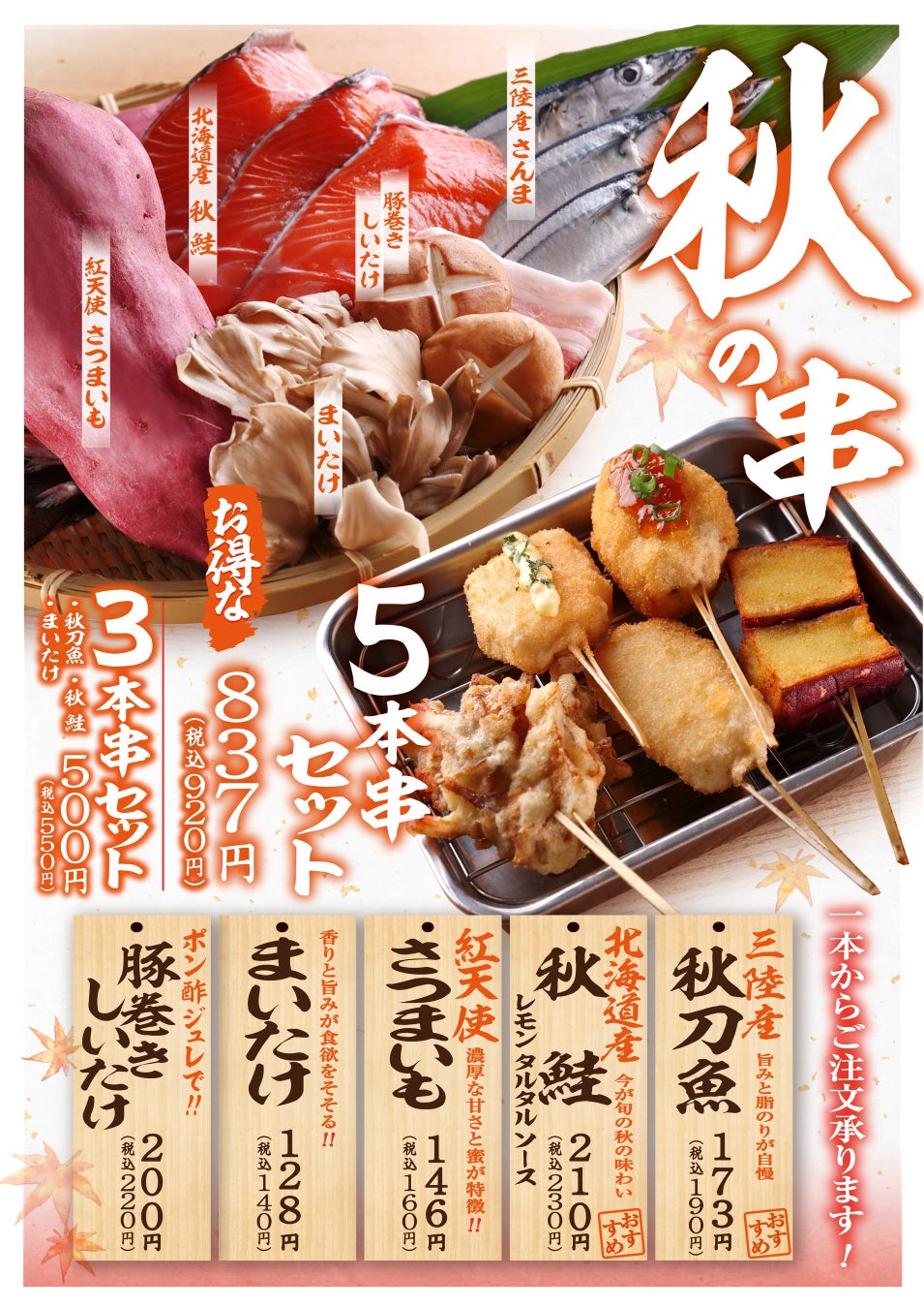 秋の季節串5種を一度にお楽しみいただけます。秋の味覚を存分に味わえるセットです。