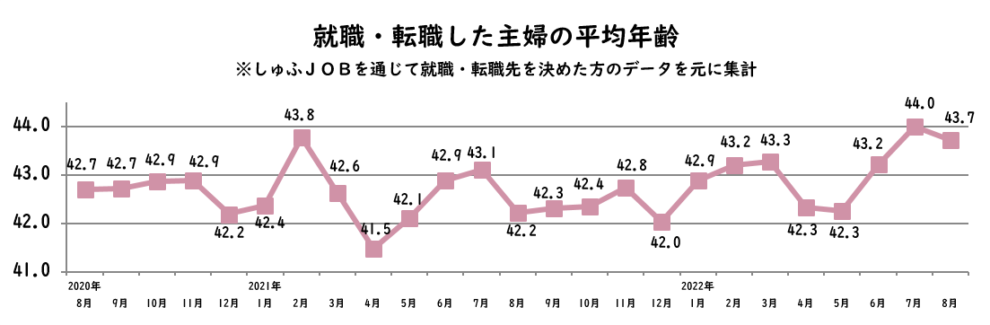 転職主婦の平均年齢は、前月比-0.3歳、前年同月比+1.5歳の43.7歳。