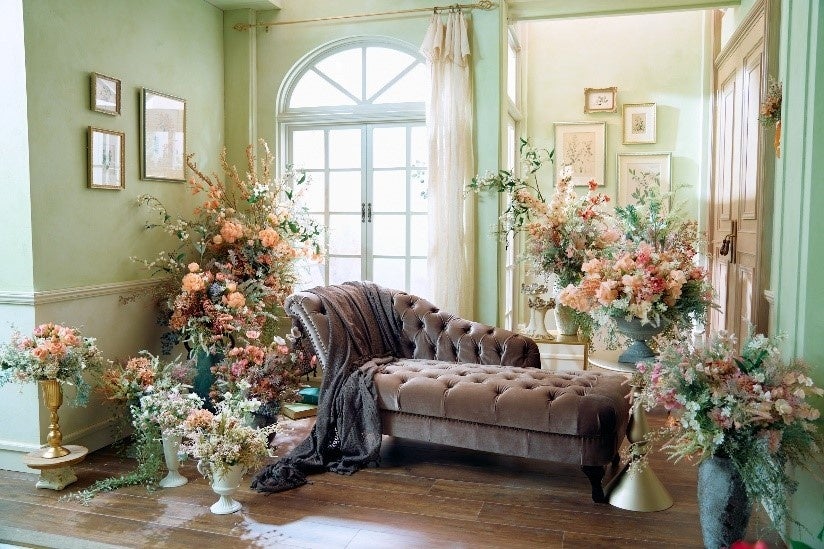 花に囲まれた空間は、まさに夢のような場所です。女性の「好き」を集めたセットで、かわいらしさと上品さを兼ね備えたデザインがとても魅力的です。白や濃いグリーンを何色も重ねて作り出す壁面や、柔らかい透け感のあるカーテン、甘すぎない大人っぽいソファー、そしてピンクベースの花材の選び方が、空間全体に統一感と洗練された雰囲気をもたらします。中央に位置する中庭とアーチ窓から差し込む光が、その空間をさらにドラマチックに演出します。