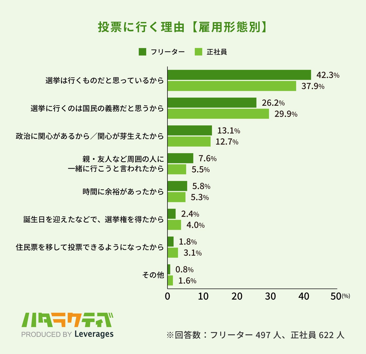 投票に行く理由について尋ねたところ、フリーター・正社員共に最も多かったのは「投票は行くものだと思っているから」、次いで「投票に行くのは国民の義務だと思うから」でした。