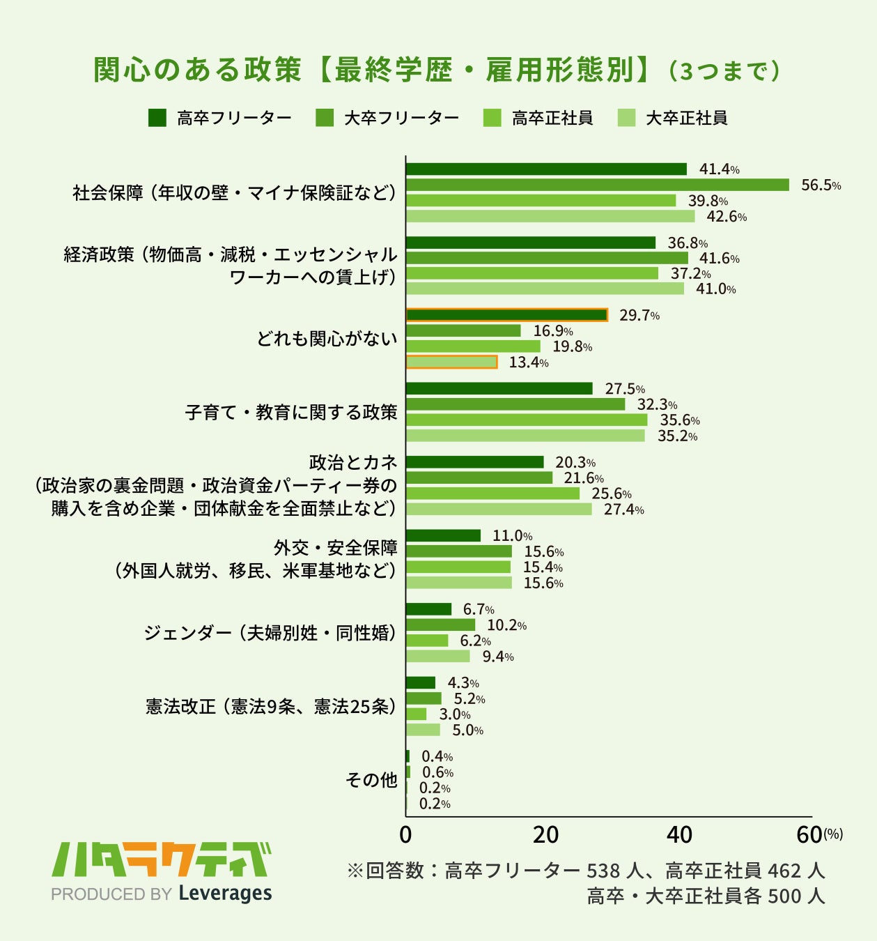 一方で、正社員の方が「子育て・教育政策」や「政治とカネ」への関心がやや高い傾向があり、高卒フリーターでは約3人に1人が「どれも関心がない」と回答していることも特徴的です。