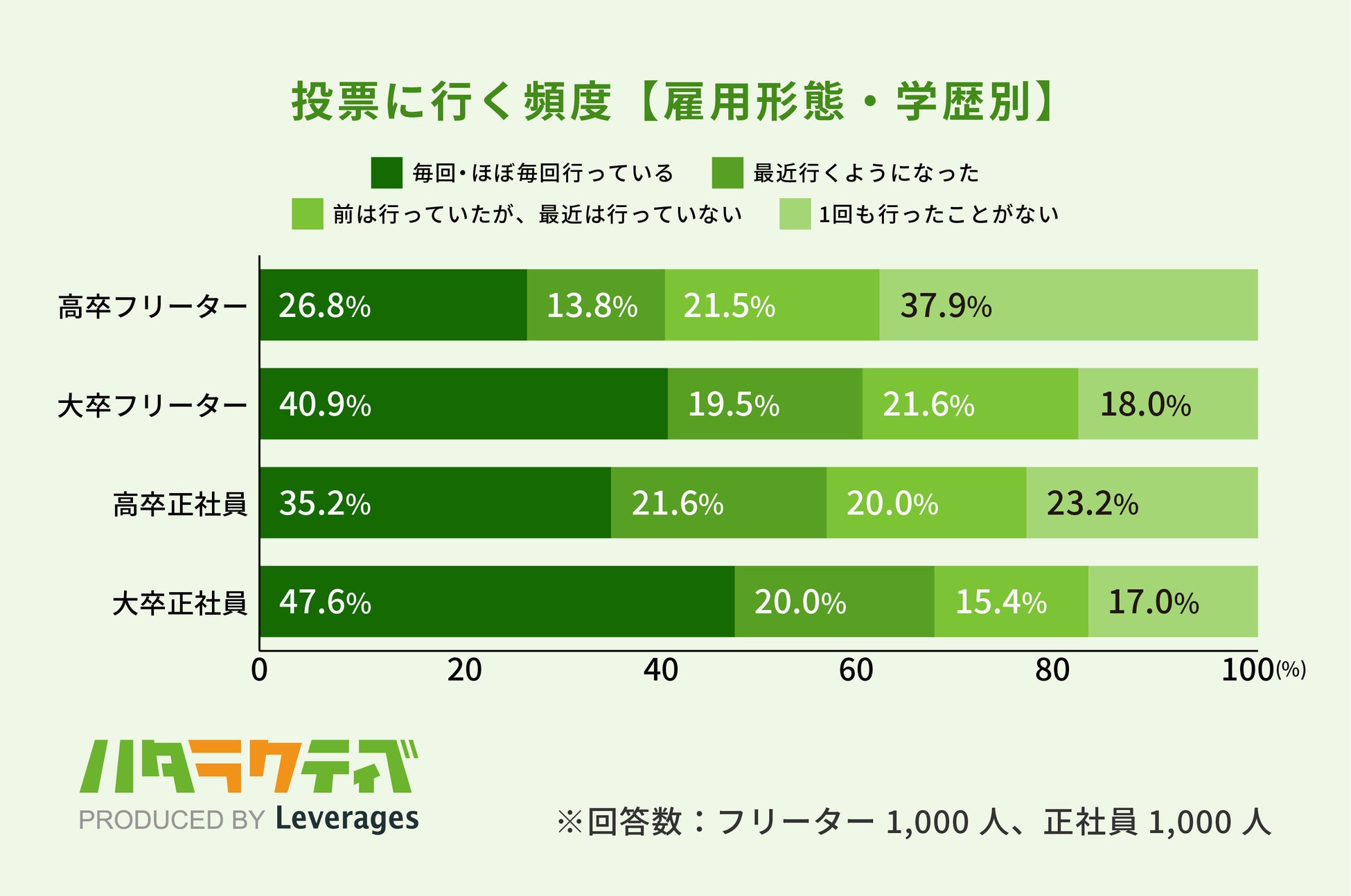 雇用形態・学歴別に投票習慣を比較すると、「毎回・ほぼ毎回行っている」と回答した人の割合は高卒フリーターでは26.8%にとどまる一方で、大卒正社員では47.6%と、20pt以上の差が見られました。