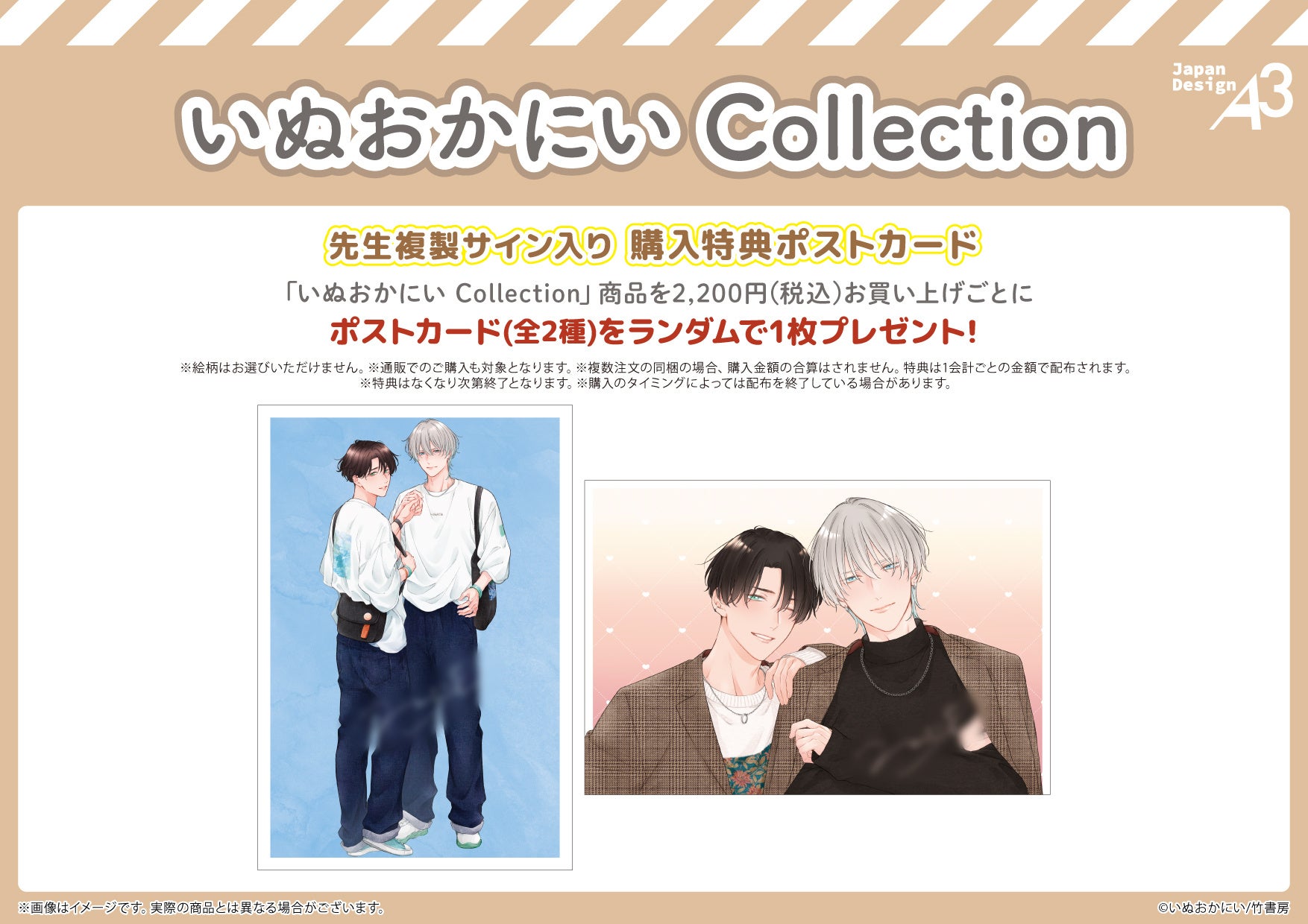 「いぬおかにい Collection」商品を1会計2,200円(税込)お買い上げごとに、購入特典としてポストカード(全2種)をランダムで1枚プレゼント。