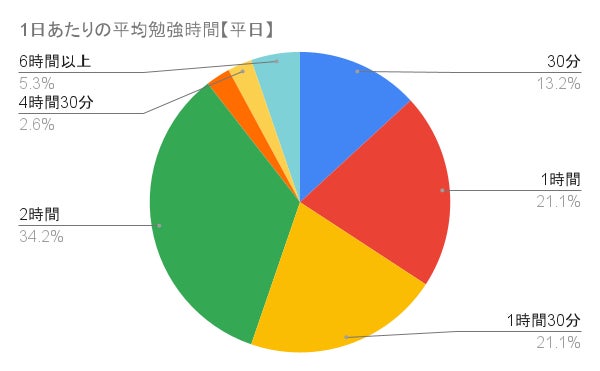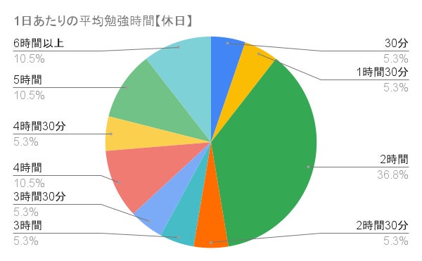 勉強時間で最も多かった回答は、平日が2時間の34.2%、休日は2時間の36.8%でした。