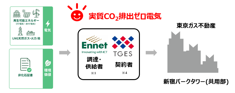 東京ガス不動産株式会社(社長:穴水 孝、以下「東京ガス不動産」)は自社保有ビルにおけるCO₂削減に貢献する取り組みのひとつとして、新宿パークタワー※1にてトラッキング付FIT非化石証書※2を購入することで、実質再生可能エネルギー電気を導入しました。