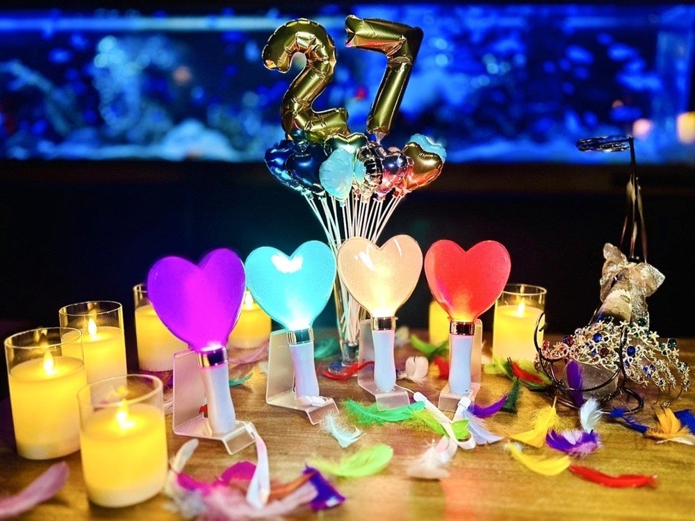食後に楽しむ推し色フラワーケーキにはメッセージも入れられるので、キュートなケーキと豊富な特典&推しグッズで、心置きなく推し活ができる。幻想的なアクアリウム空間で推し活を楽しんでみて。