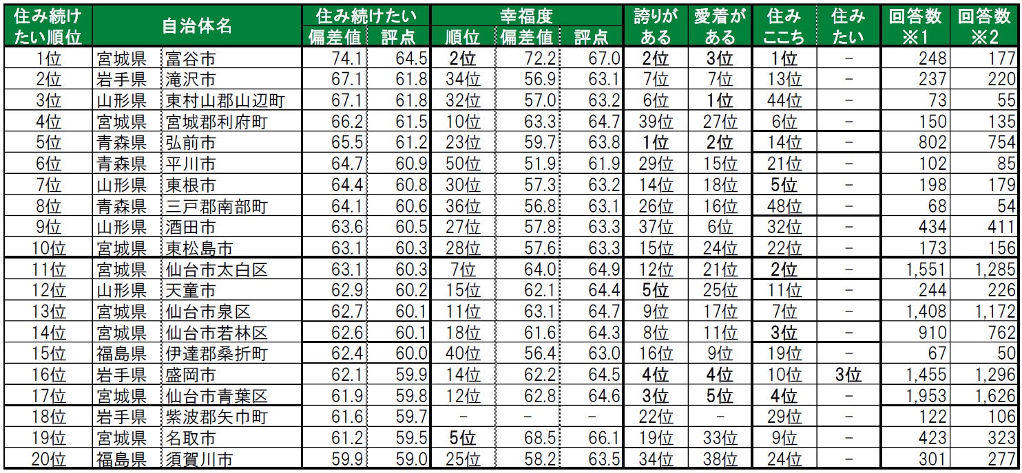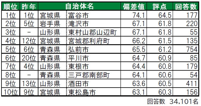 1位は2年連続で宮城県富谷市で、「住みここち」1位、「街の幸福度」「街に誇りがある」2位、「街に愛着がある」3位と各ランキングで高い評価を得ている街です。2位は岩手県滝沢市で、「街に誇りがある」「街に愛着がある」では7位です。3位は山形県東村山郡山辺町で、昨年は累計回答数が50名未満だったためランキング集計対象外だった町で、「街に愛着がある」では1位となっています。