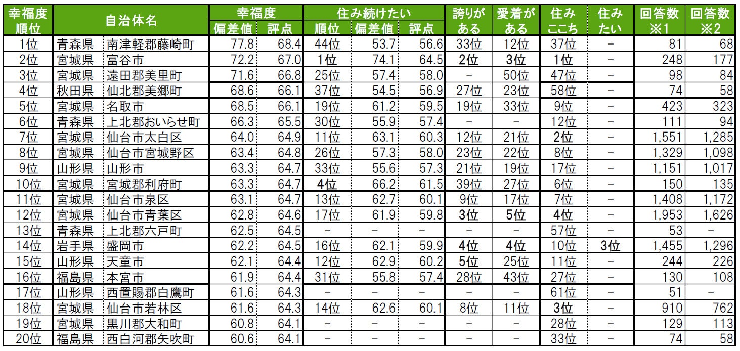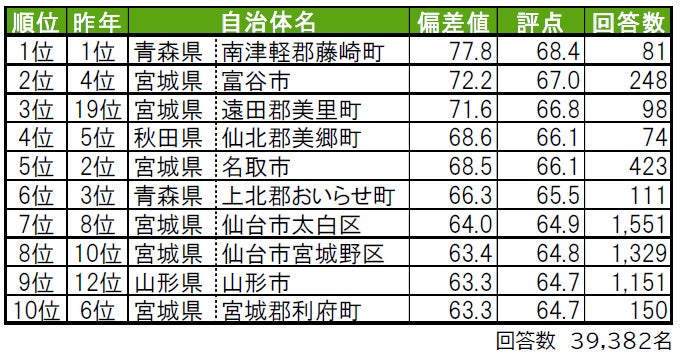 いい部屋ネット「街の幸福度 & 住み続けたい街ランキング2022<東北版>」(街の住みここちランキング特別集計)発表