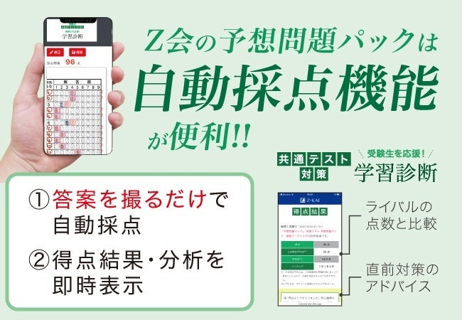 株式会社増進会ホールディングス(Z会グループ)のグループ会社、株式会社Z会ソリューションズは、Z会の共通テスト対策書籍シリーズ(共通テスト予想問題パックなど)に対応している「学習診断サイト」に、追加機能をリリースいたしました。Z会の共通テスト対策書籍シリーズご購入者様であれば、2022年12月1日より「自動採点機能」を無料でご利用いただけます。