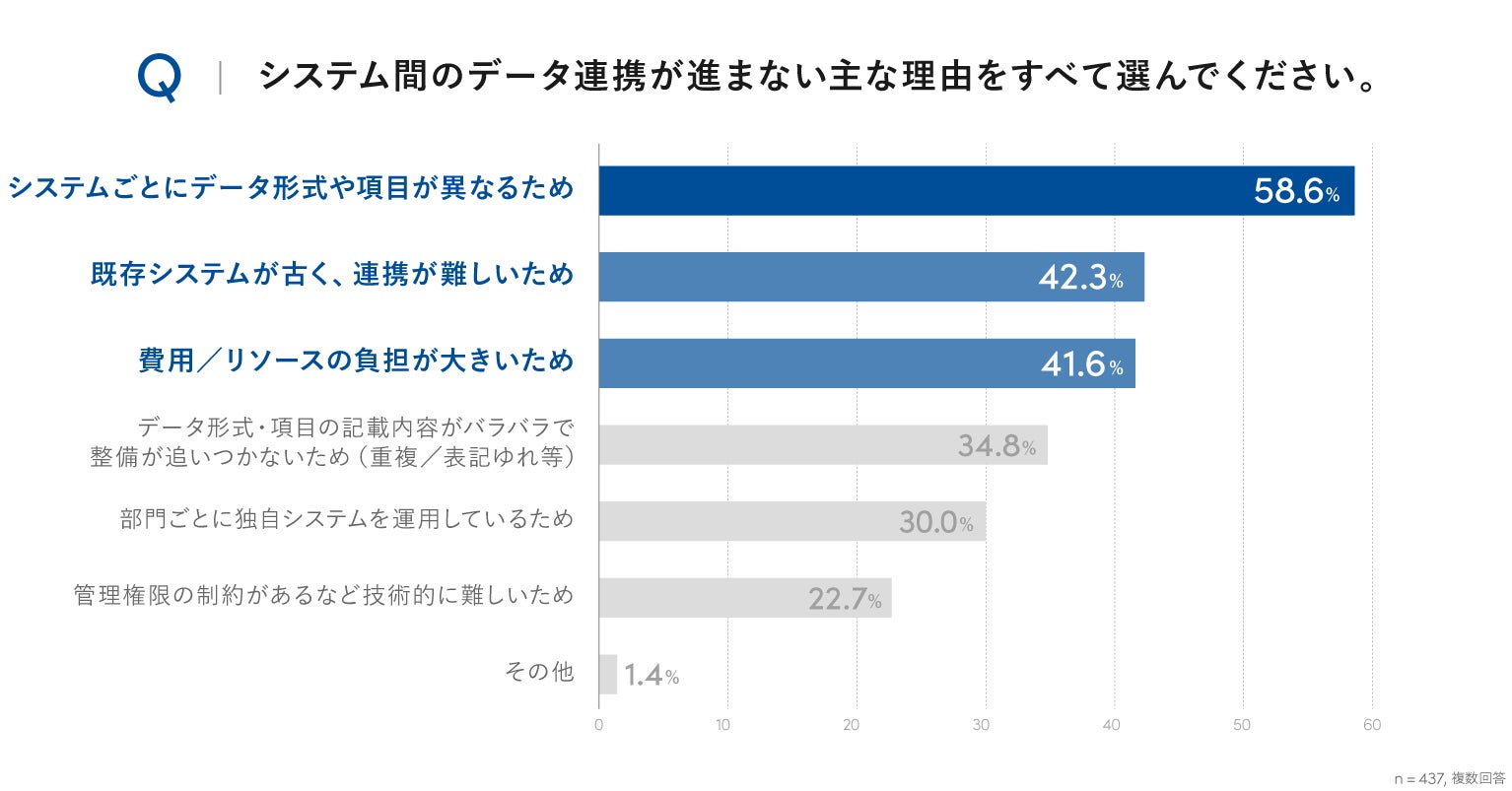 データ連携が進まない理由としては、「システムごとにデータ形式や項目が異なる」(58.6%)、「既存システムが古く、連携が難しい」(42.3%)、「費用・リソースの負担が大きい」(41.6%)が挙げられました。