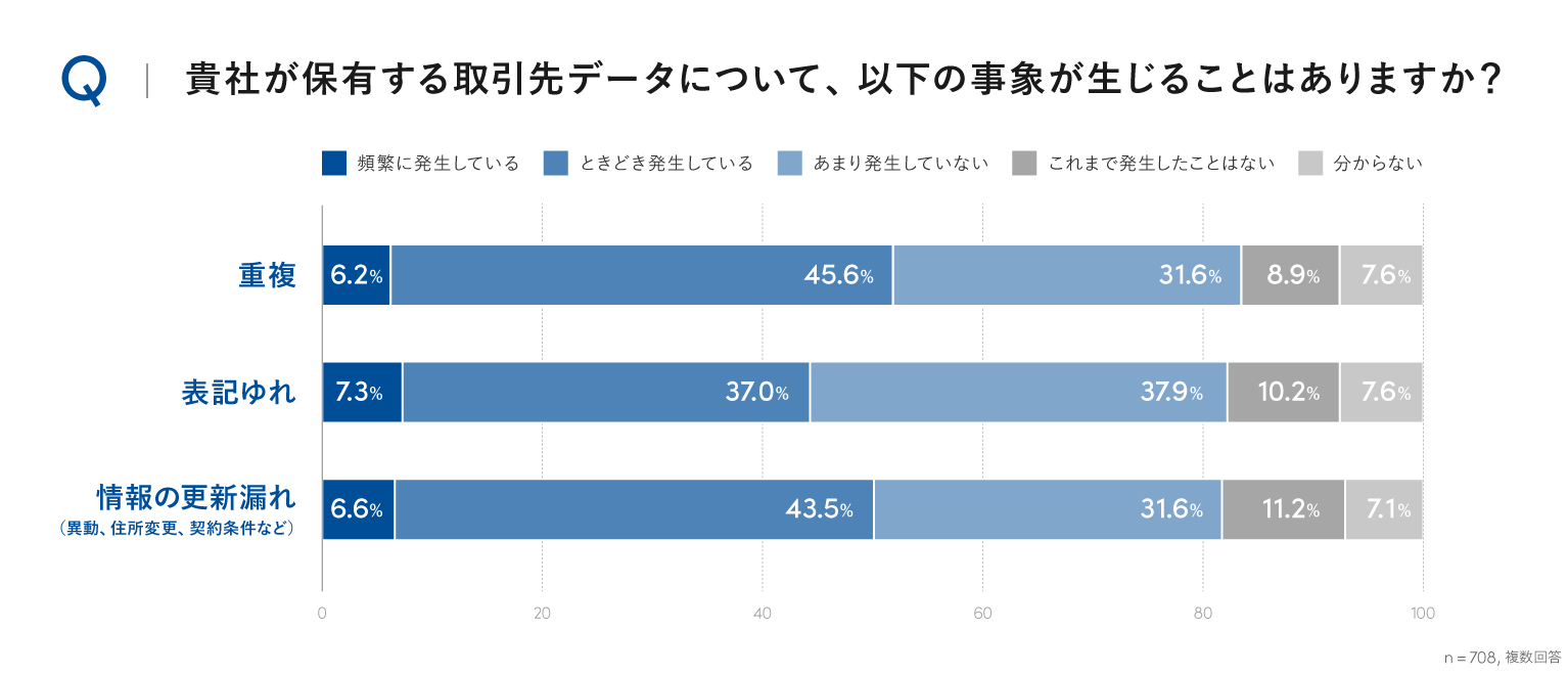取引先データの品質について尋ねたところ、83.5%が「重複」、82.2%が「表記ゆれ」、81.8%が「更新漏れ(異動・住所変更・契約条件など)」の経験があるという結果でした。