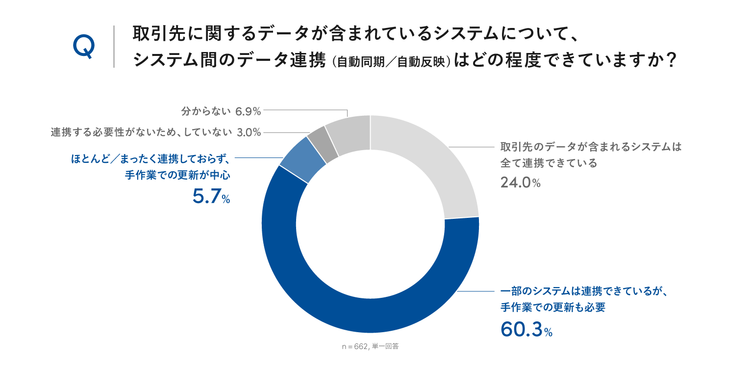 取引先データを扱うシステム間で、データ連携ができているかを尋ねたところ、「一部のシステムは連携できているが、手作業での更新も必要」または「ほとんど/まったく連携しておらず、手作業での更新が中心」と回答した企業が66.0%にのぼりました。
