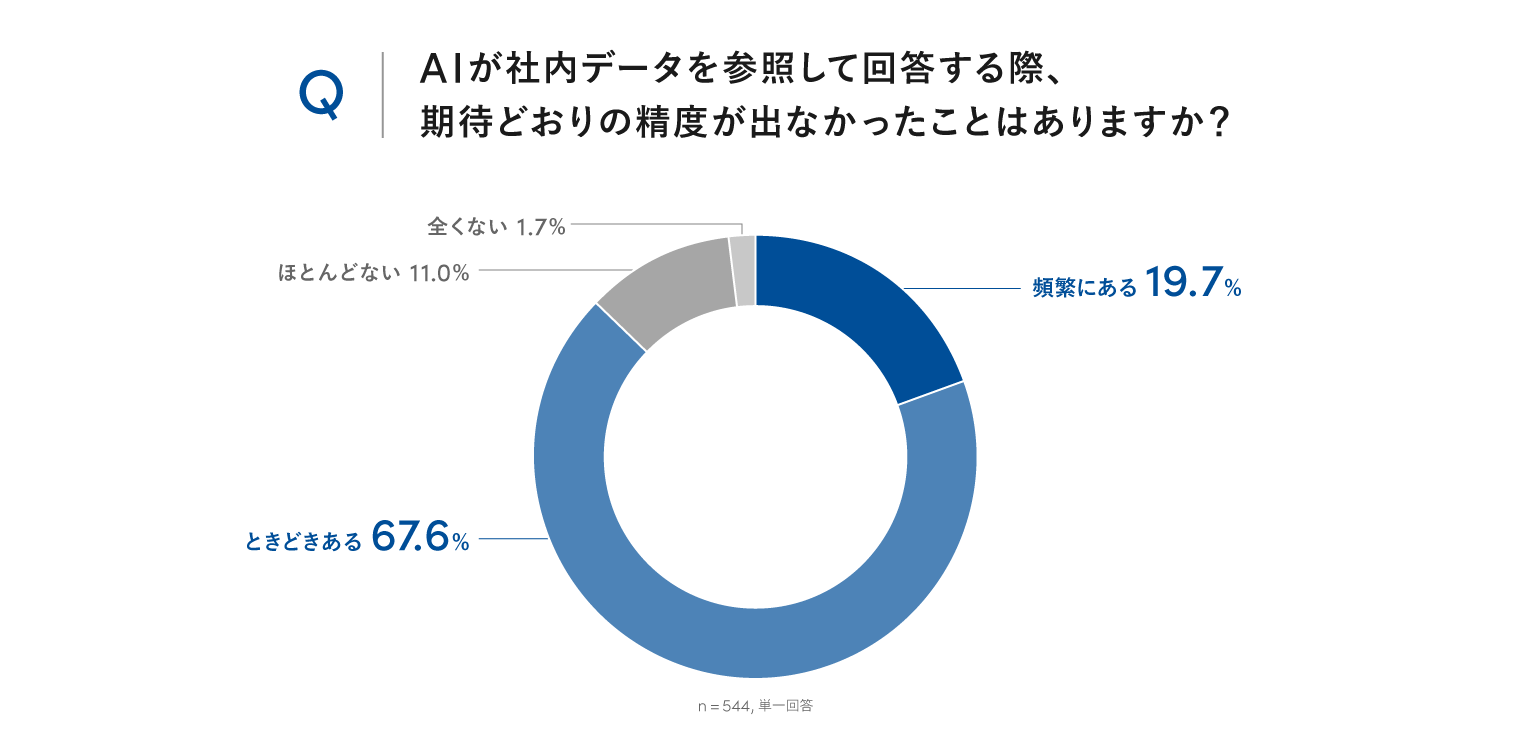 AIとシステムを連携している企業のうち87.3%が、AIが社内システム上のデータを参照しても期待どおりの精度が出ないことが「頻繁にある」または「ときどきある」と回答しました。データ基盤の整備不足が、AI活用の効果にも影響していることがうかがえます。