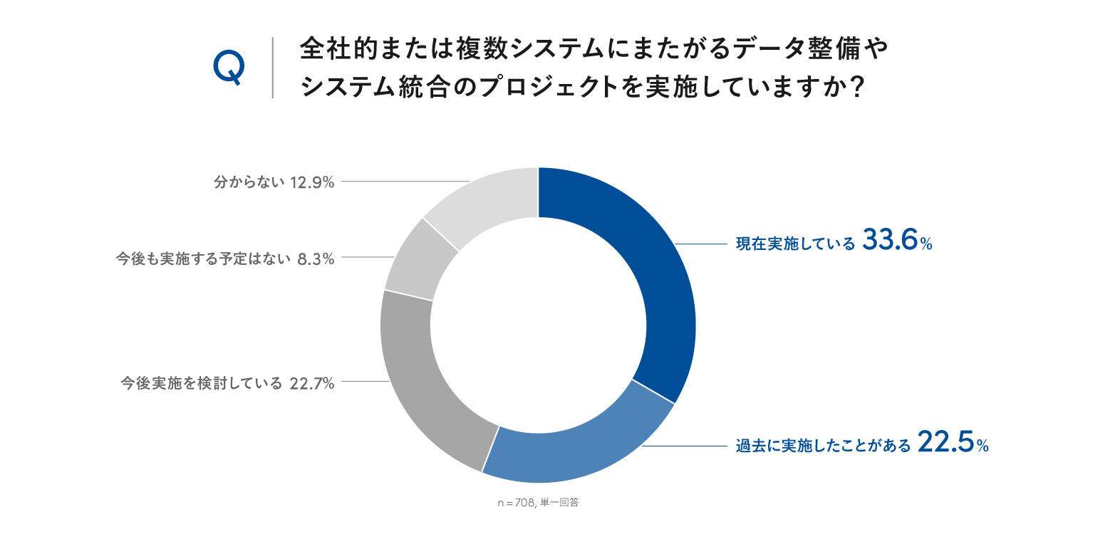 自社においてシステム統合やデータ整備のプロジェクトを実施しているか尋ねたところ、現在実施している企業が33.6%、過去に実施した企業が22.5%でした。両者を合わせると56.1%と、半数を超える企業が何らかの形で取り組みを進めていることが明らかになりました。