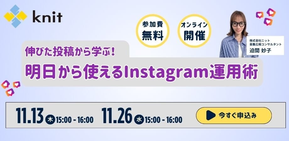 このたび、大学・短大・専門学校など教育機関の広報・入試担当者の皆さまを対象に、「Instagramを活用した募集広報戦略」をテーマとした無料オンラインセミナーを、2025年11月13日(木)および26日(水)に開催いたします。
