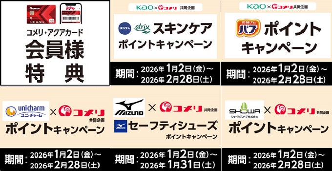 ホームセンターの「コメリパワー」や「コメリハード&グリーン」を通し地域のライフラインであり続けたいと願う株式会社コメリ(所在地:新潟県 新潟市、代表取締役社長:捧 雄一郎)は、コメリの決済手段「コメリカード」「アクアカード」会員様特典として、2026年1月から5種の期間限定キャンペーンを新たにスタートいたしました。