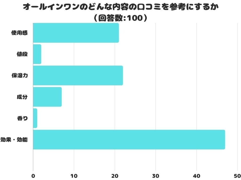 オールインワンのどんな内容の口コミを参考にするかをアンケートにて調査したところ、1位は「効果・効能」でした。