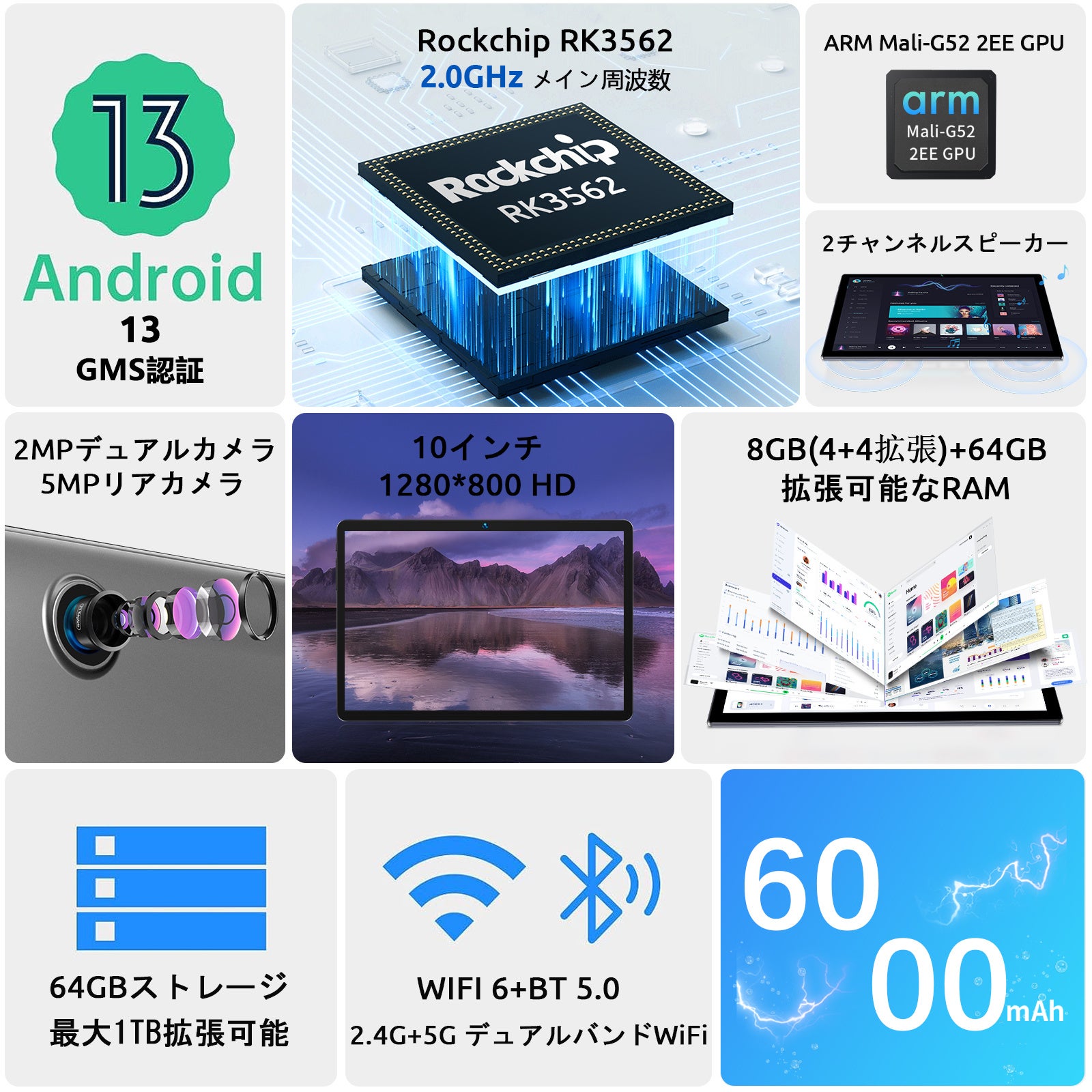 Android 13/8GB+64GB/10.1インチ/6000mAh/1280*800