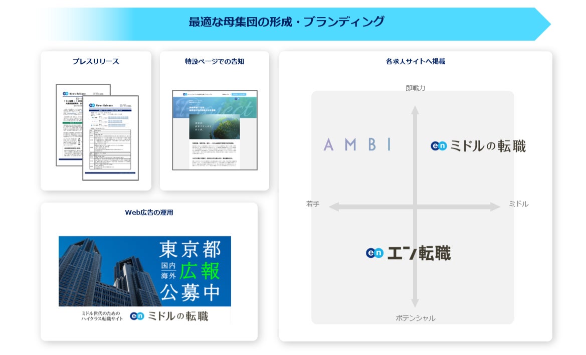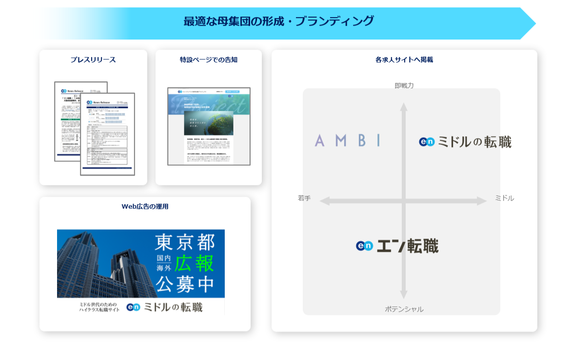 プレスリリースや特設ページ、Web広告での告知に加え、各求人サイトでの集客支援を行ないます。『エン転職』『AMBI』『ミドルの転職』とターゲットの異なる3つの求人サイトを活用することで、ターゲットへ網羅的に求人を届けます。