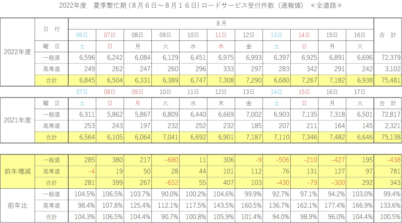 JAF(一般社団法人日本自動車連盟 会長 坂口正芳)は、お盆期間(2022年8月6日~8月16日まで)のロードサービス受付件数(速報値)をまとめました。