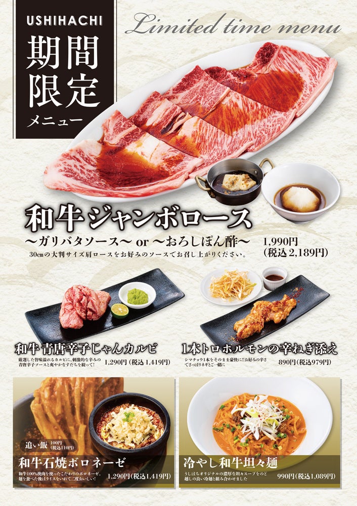 厳選黒毛和牛をお手頃価格で堪能できる焼肉店「USHIHACHI(ウシハチ)」では、今の時期にぴったりのメニューを集結させた『期間限定メニュー』を8月21日(月)~9月21日(木)の1ヵ月限定で全店舗にてご提供いたします。