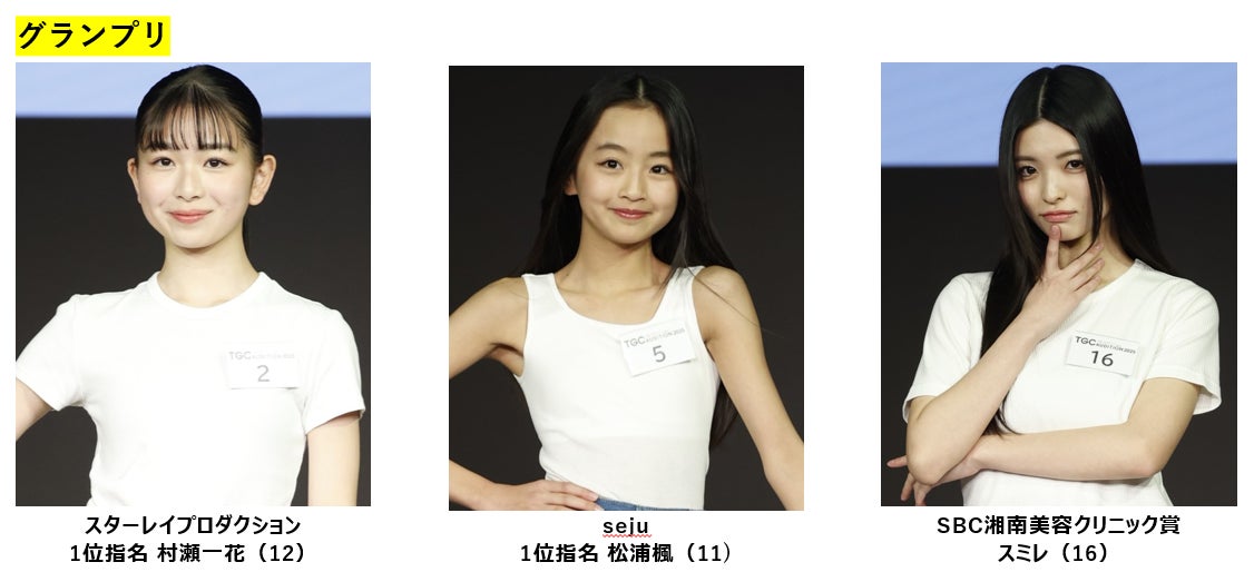 モデル、タレント、女優、アーティストを目指す9歳以上の女性(2024年8月時点で小学4年生以上の方)で、特定の芸能プロダクションに所属していないアマチュアの方を対象に、今年は約6,000人もの応募の中から1次審査〜3次審査を通過した37名が最終審査に挑みました。そして、公開ドラフト会議で各事務所から1位指名を受けたファイナリスト5名から、見事グランプリに村瀬一花さん(12)、準グランプリに中西聖彩さん(15)が輝きました。グランプリの村瀬さんは「まさか自分がグランプリを獲るとは思っていなくて、今は家族への感謝と嬉しさでいっぱいです」と語りました。また、SBC湘南美容クリニック賞にはスミレさん(16)が選ばれ、この3名は、2025年3月1日(土)に開催の『第40回 マイナビ 東京ガールズコレクション 2025 SPRING/SUMMER』の出演が決定。プレゼンターのNikiさんは、「今日はスタート地点であり、選ばれなかった仲間の分の気持ちを背負って頑張ってほしい」と熱い思いを話し、同じくプレゼンターの鳥谷敬さんは「皆さんのチャレンジする姿を見て、自分も年齢に関係なくチャレンジしたい」と語りました。