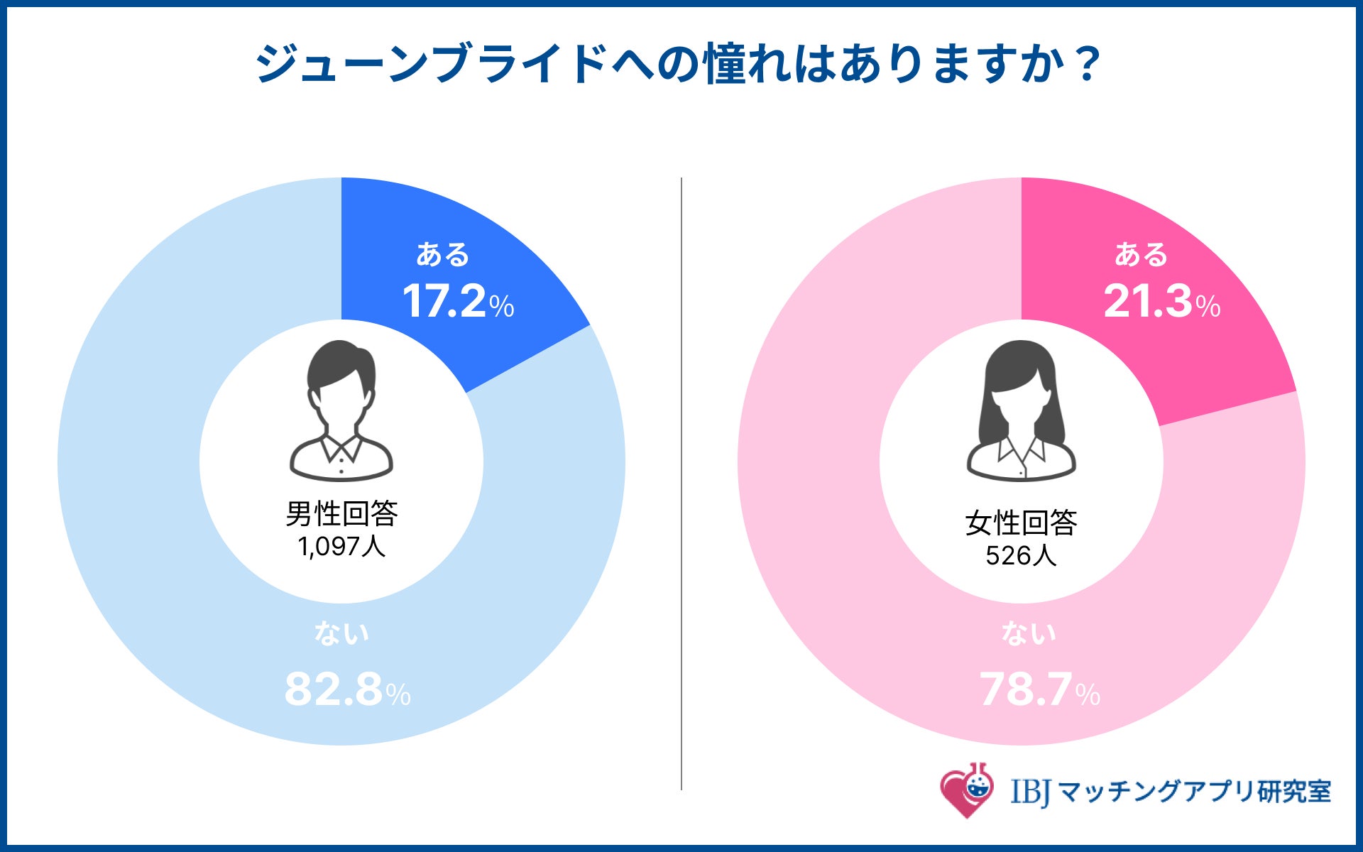 ジューンブライドに憧れはあるかを調査したところ、「ある」と回答したのは男性17.2%、女性21.3%という結果に。現代の婚活者は、ジューンブライドに対する関心が薄れていると言えそうです。