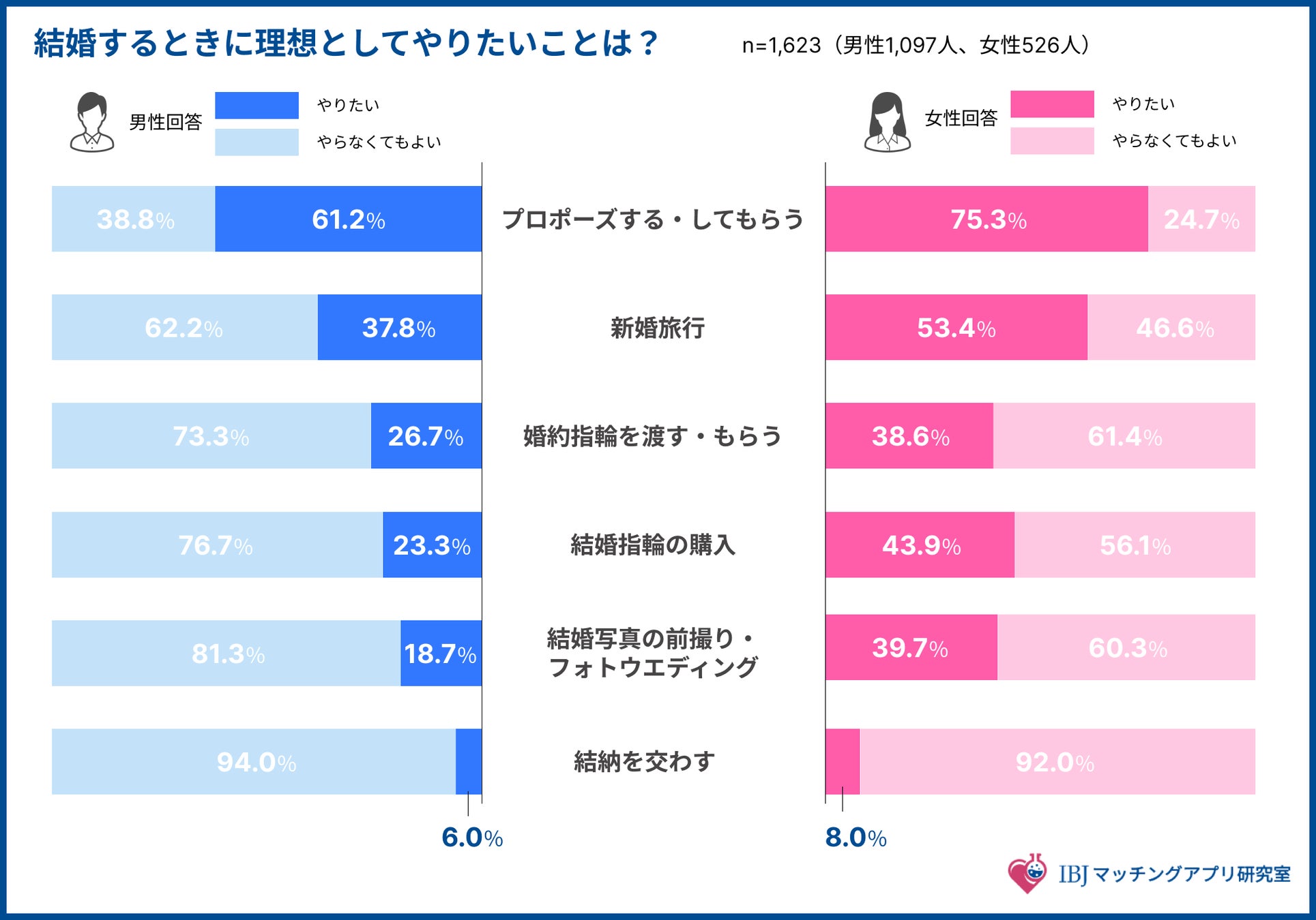 結婚をするときにやりたいこととして、男女ともにプロポーズが最多。特に女性は75%以上がプロポーズをしたい・してもらいたいと回答。