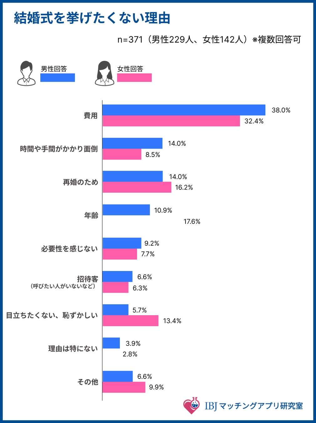 「結婚式を挙げたくない」理由として、男女共に「費用」を選択。