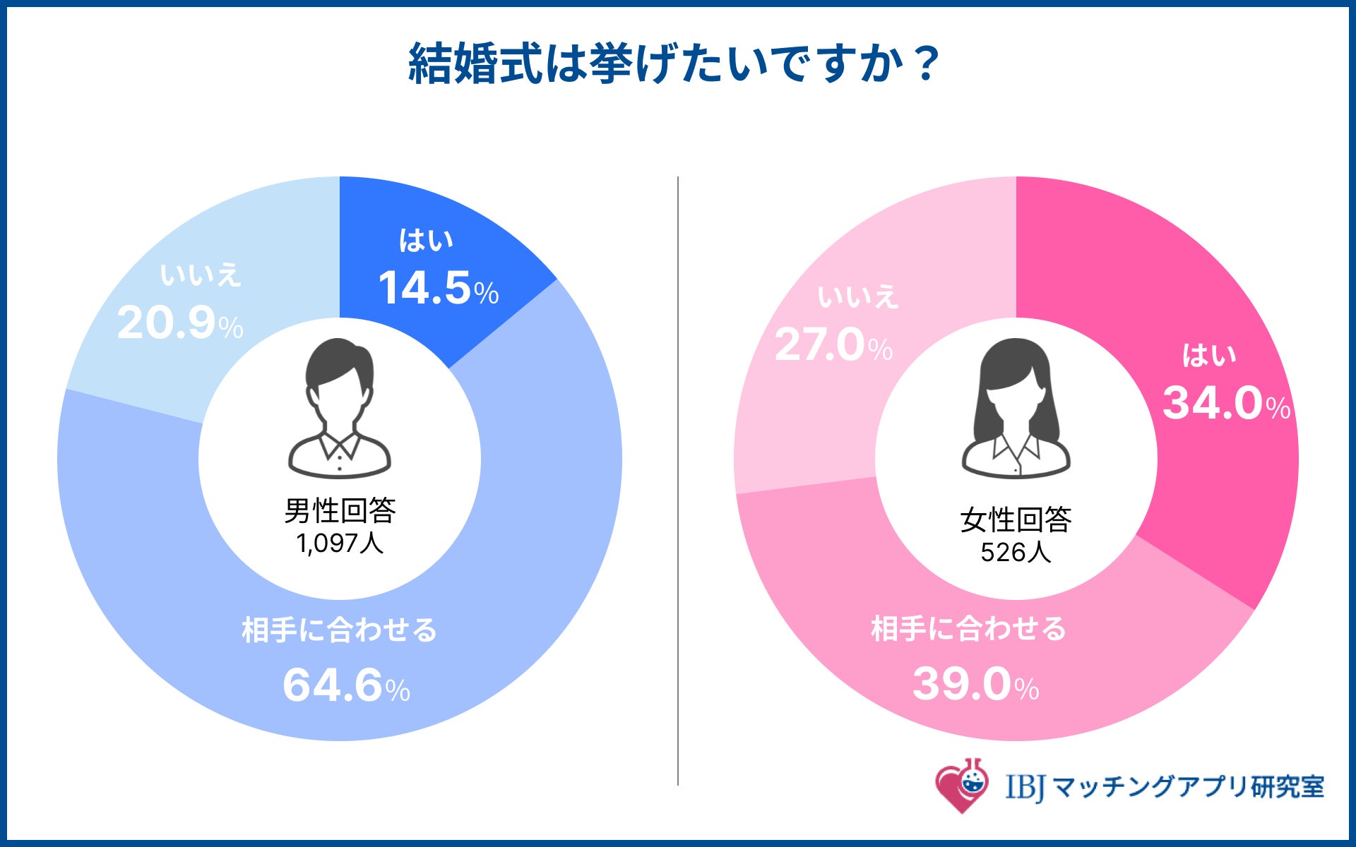 結婚式を挙げたいかという質問に対し、男女ともに「相手に合わせる(男性:64.6%、女性:39.0%)」が最多という結果に。特に男性は、女性の1.6倍「相手に合わせる」と回答した方の割合が高いため、女性の意見を尊重していることがうかがえます。