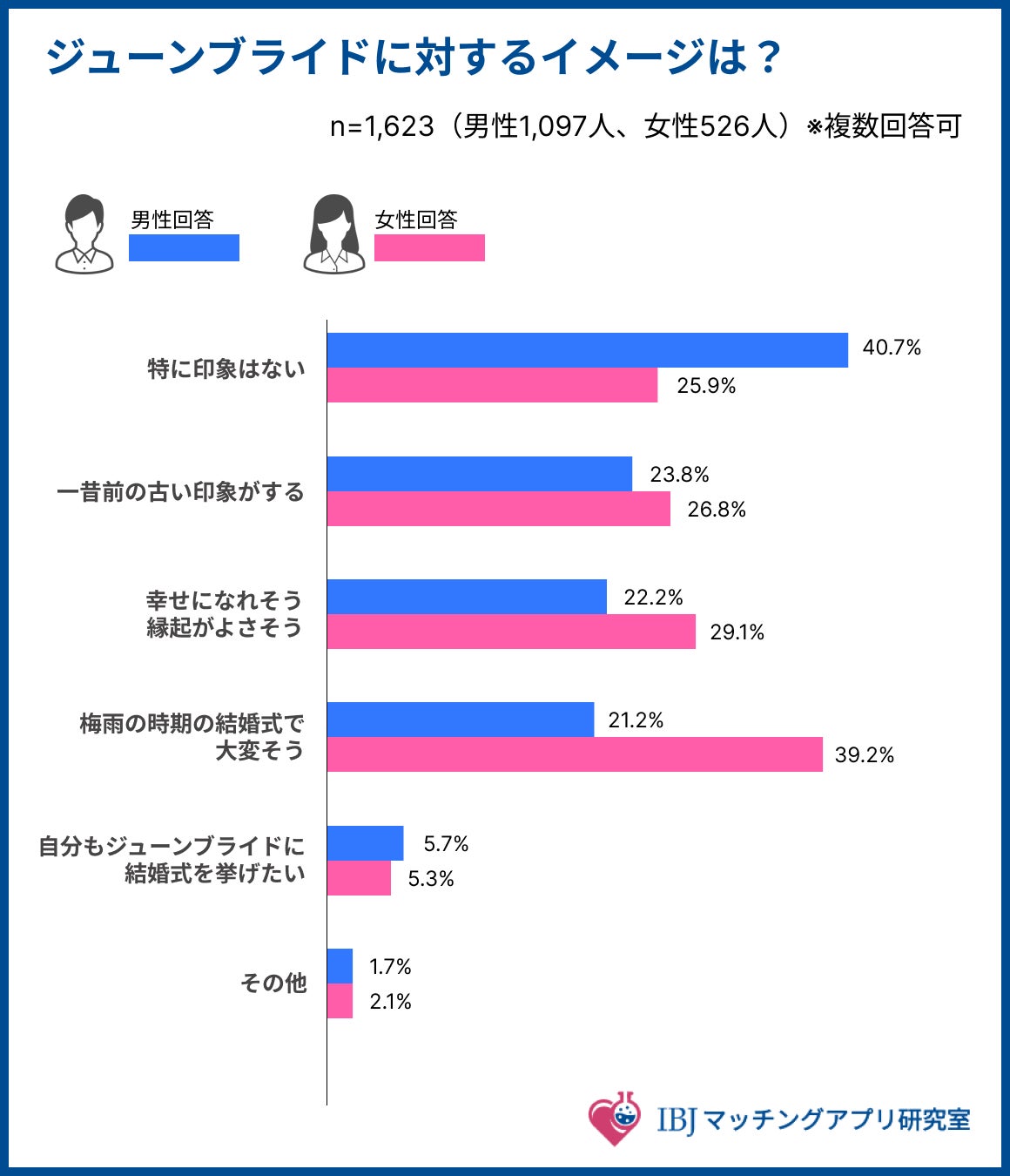 ジューンブライドに対するイメージ調査の結果、男性は「特に印象はない(40.7%)」女性は「梅雨の時期の結婚式で大変そう(39.2%)」が最多に。