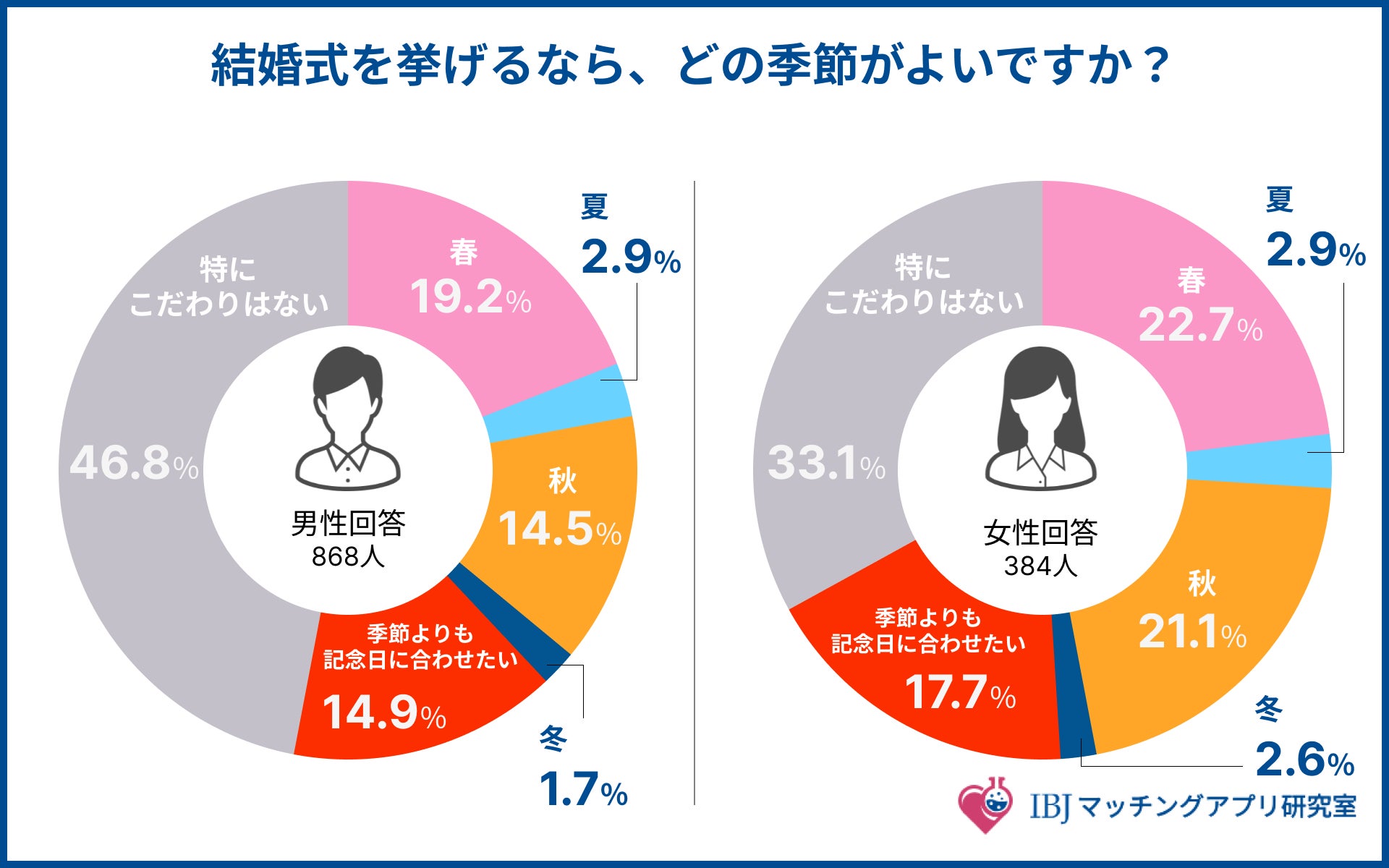 結婚式を挙げる季節は男女ともに、「特にこだわりはない(男性:46.8%、女性:33.1%)」が最多に。季節にこだわりはなく、タイミングを大切にしたいという声が聞かれました。