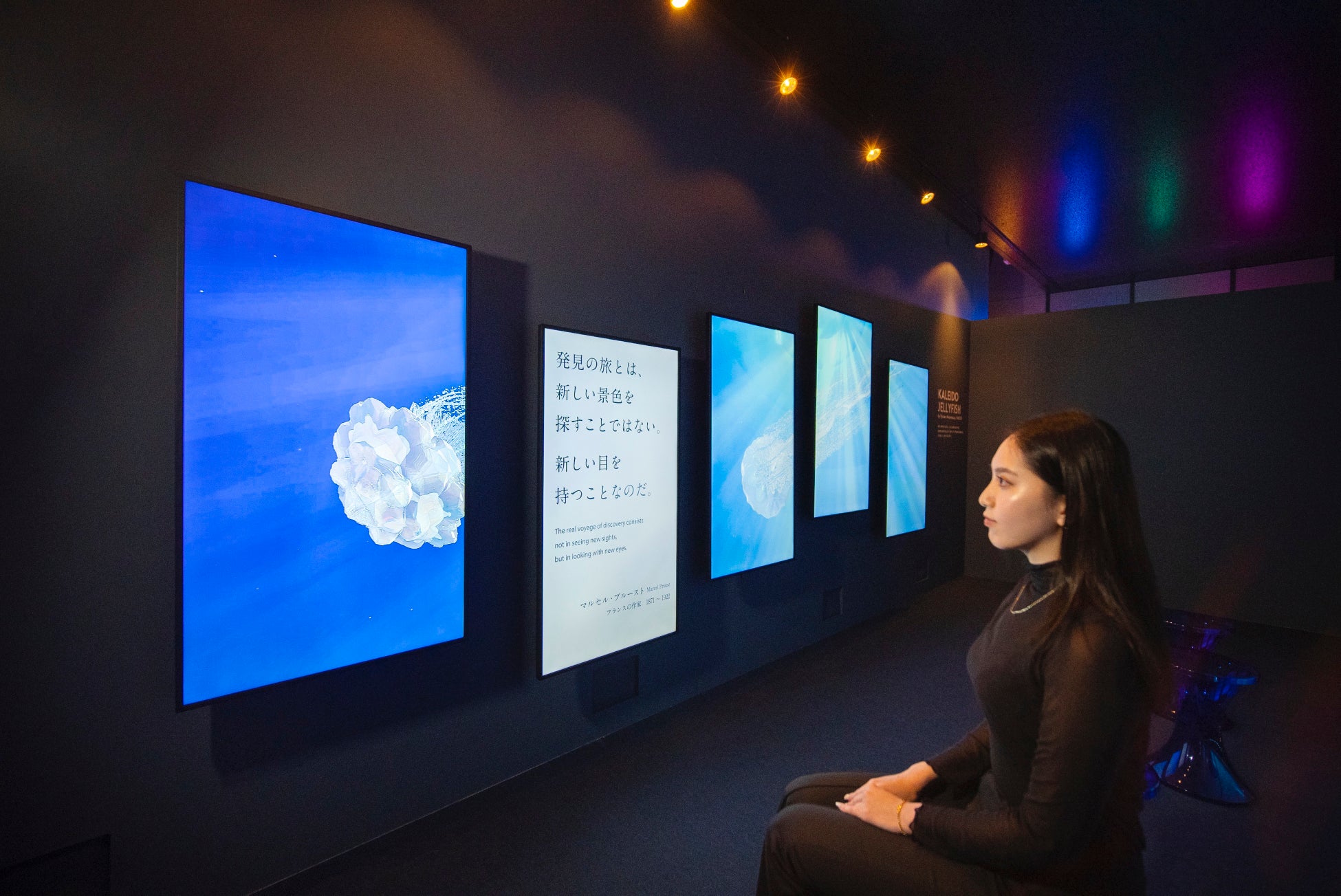 クラゲをモチーフとした、村松亮太郎のアート。その曖昧で神々しい自動生成を繰り返すモザイクが描くクラゲの姿に自分の意識を委ね、心を鎮める。
