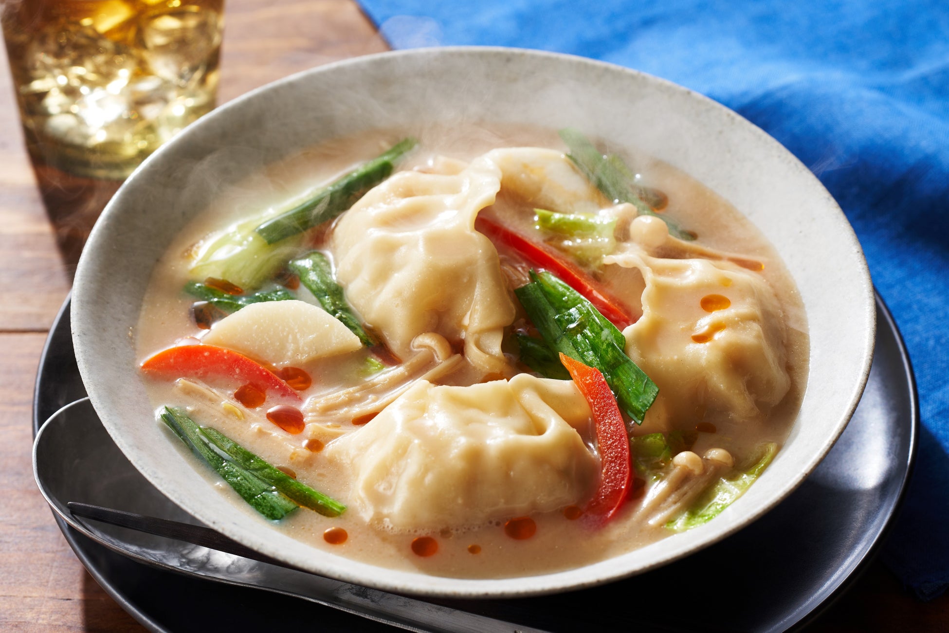 商品説明:プラントベースの餃子をメインの具材に、食感が楽しい長いもをはじめ、彩り豊かな野菜を組み合わせました。ねりごまと豆乳ベースのコクが楽しめる、食べ応えある担々スープに仕立てています。