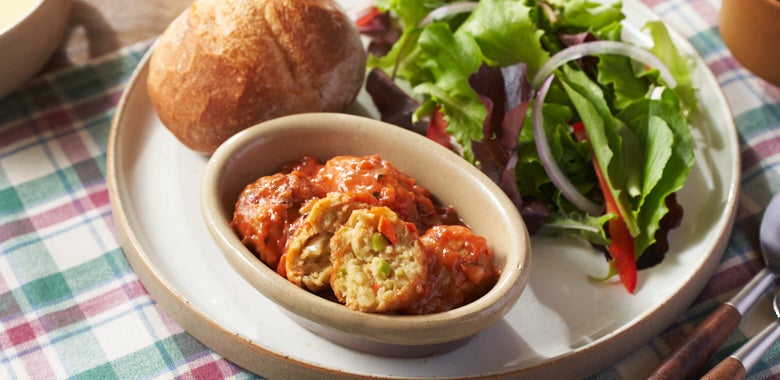 商品説明:プラントベースミートに枝豆やにんじん、玉ねぎを加え、一粒で色々な食材や食感が楽しめるミートボールに仕上げました。P肉の他に国産大豆100%の豆腐も使用し、口当たりよく仕上げています。トマトの旨味が凝縮した酸味が抑えめなソースも入っており、温めればすぐにお召し上がりいただけます。温めてソースごとパスタにかけるなどアレンジも簡単です。