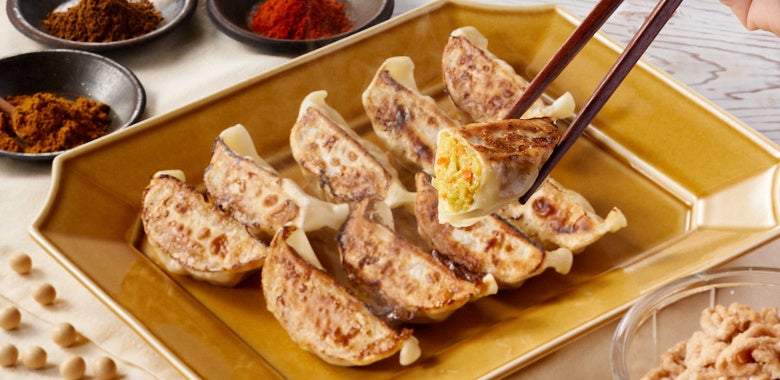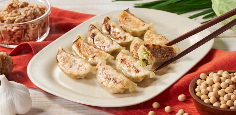 商品説明:本物のお肉のような弾力を目指したこだわりのプラントミートを使った餃子。キャベツ・ニラと薬味ににんにく、しょうがを使い、もちもちの皮でジューシーに仕上げました。ごま油が隠し味となっています。