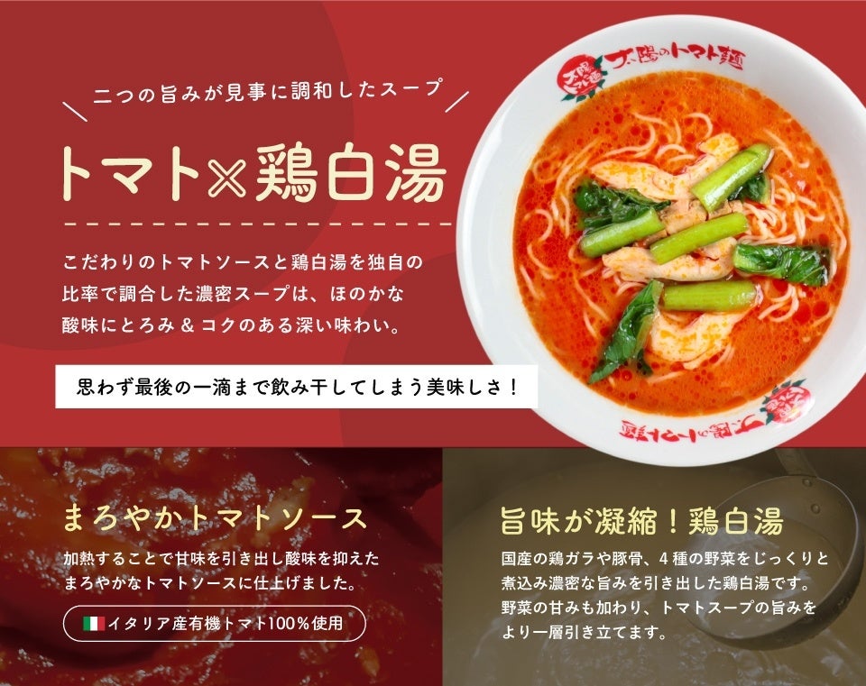 すすればわかる、究極の一杯!2017年 「太陽のトマト麺」 創業10周年記念で、実店舗にて限定メニューとして登場。2ヶ月で20,000食以上の爆発的大ヒットを記録したあのメニューが通販限定で2023年復刻販売。