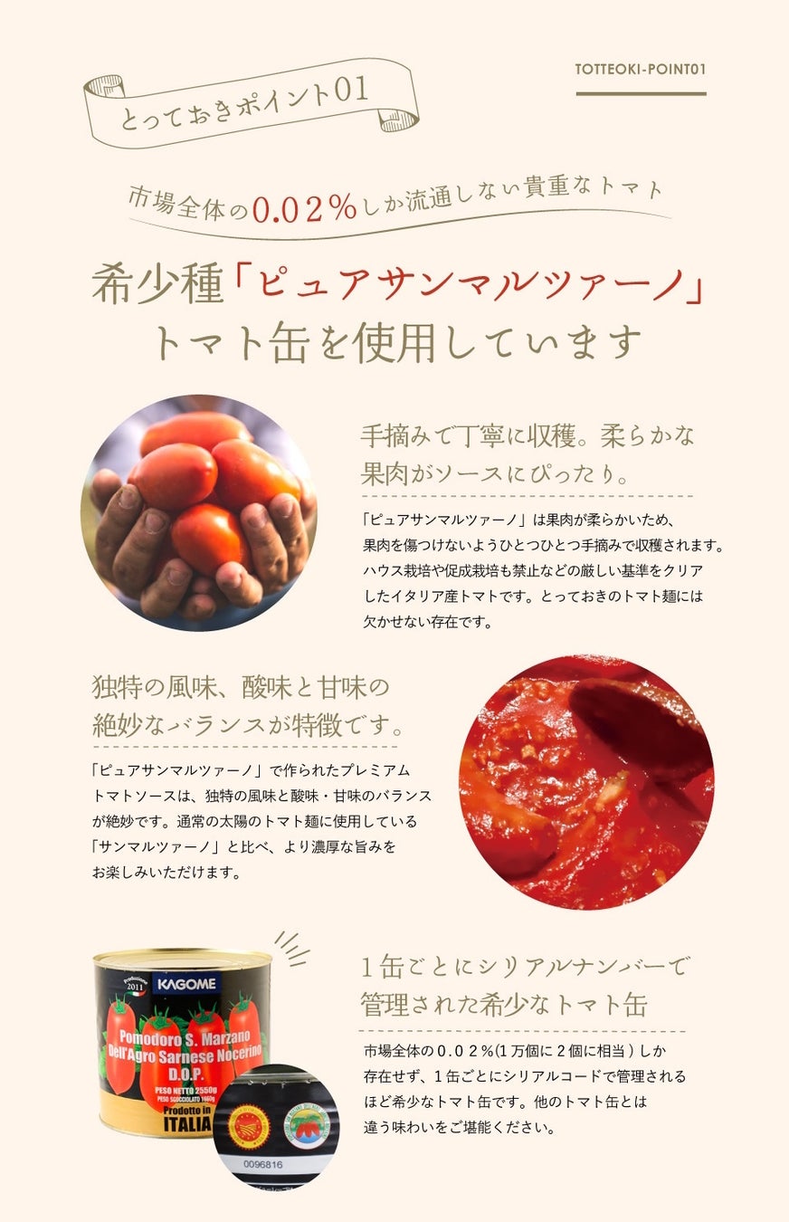 市場全体の0.02%(1万個に2個に相当)しか流通しない貴重なトマト!希少種「ピュアサンマルツァーノ」トマト缶を使用しています。