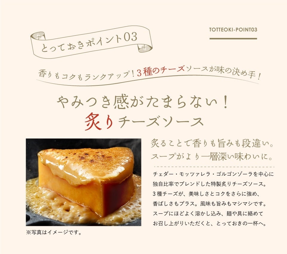 やみつき感がたまらない!炙りチーズソースが味の決め手!炙ることで香りも旨みも段違い。スープがより一層深い味わいに。