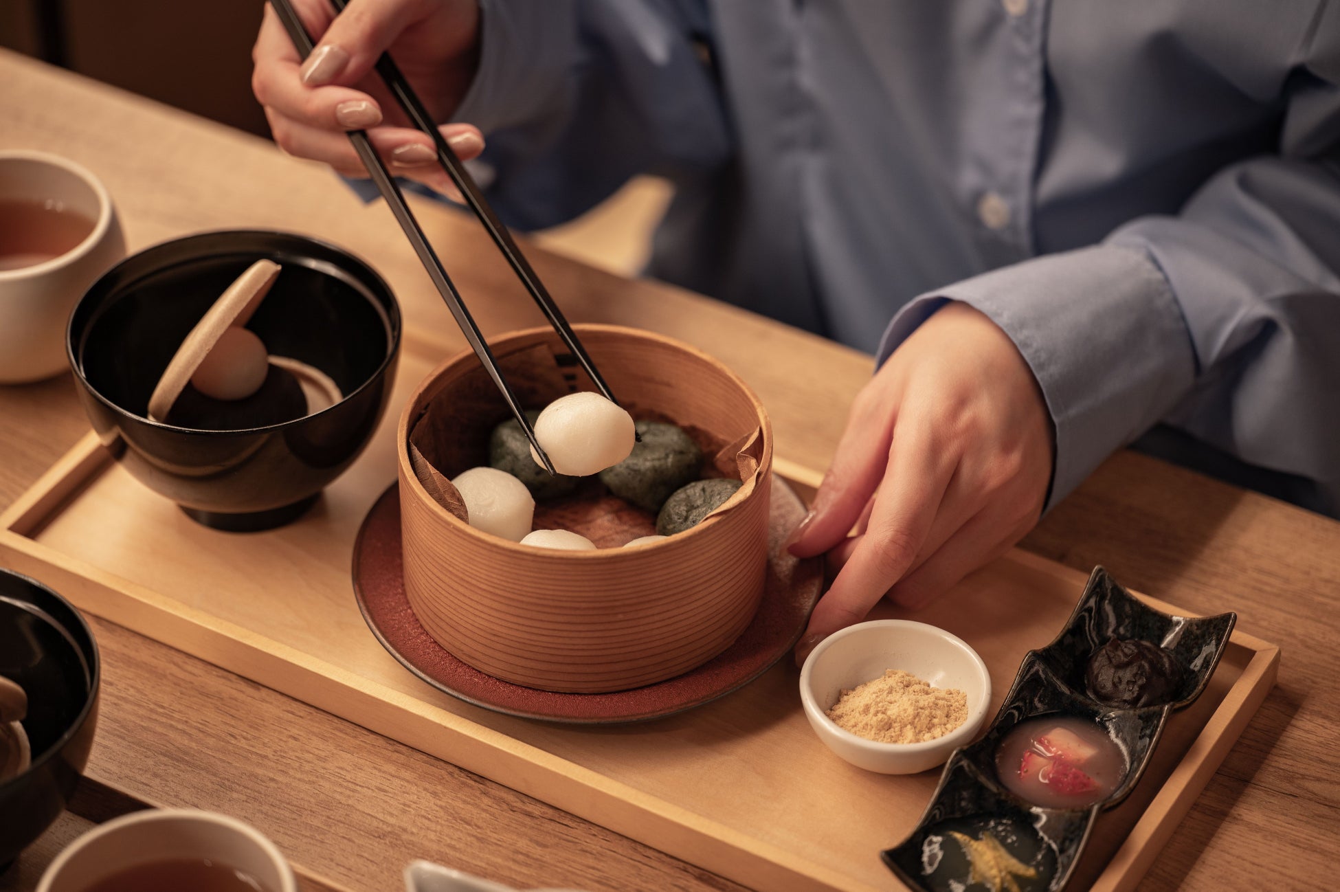 こたつの小上がり席でお楽しみいただける、冬限定の甘味体験。朴葉で蒸した“生麩もち”を、蒸したてのままご提供いたします。